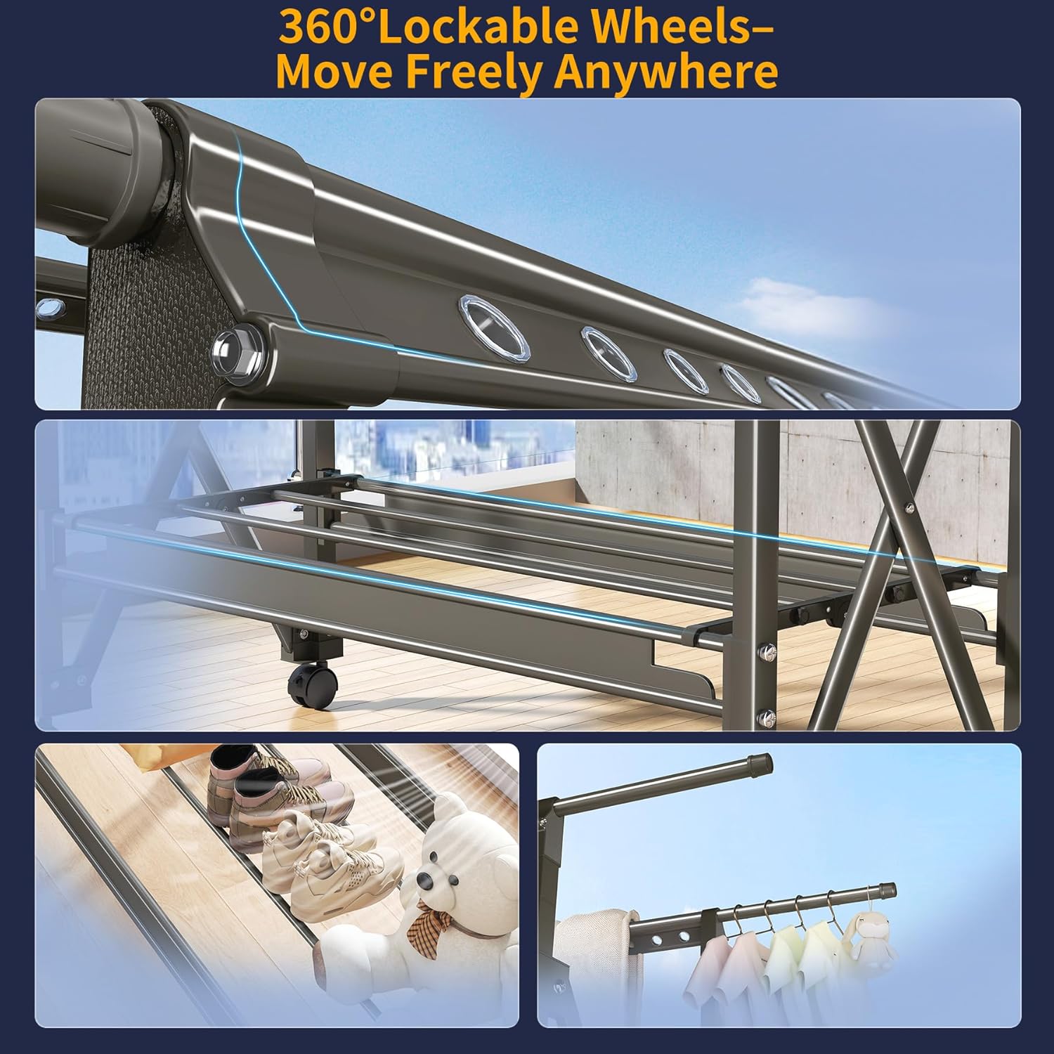 • Enhanced Drying Design with 4 Upgrades – Evenly-spaced windproof holes speed up drying, telescopic rods support multiple drying methods for different garment lengths, upgraded mesh shelf keeps sweaters flat without deformation, and reinforced crossbeam ensures stability and durability.